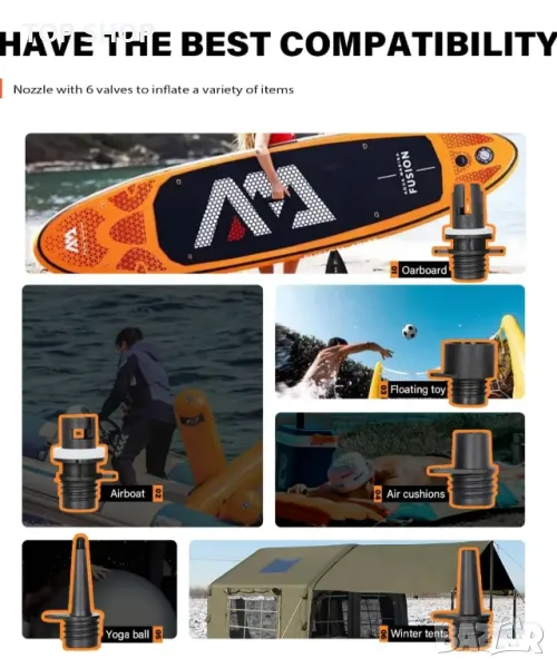 【Гъвкавост и съвместимост】помпата за дъска с гребло се предлага с 6 дюзи за различни надуваеми съоръжения, включително SUP сърфове, надуваеми каяци, топки за йога, надуваеми палатки, плувни басейни, надуваеми дивани и надуваеми дюшеци; В допълнение, тази надуваема помпа за дъска за гребане е оборудвана със светлина, за да осигури осветление през нощта за пътуване