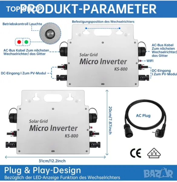 Тегло: 1,8 кг. Материал: Алуминиева сплавВодоустойчив клас: IP65 Режим на комуникация: WLAN Система за наблюдение: Мобилно приложение Режим на разсейване на топлината: Самоохлаждане Панели за препоръчителна употреба: 2*400WattMax. Единица на разклонителна верига: 10 броя (монофазни). Режим на пренос на мощност: обратно предаване, приоритет на натоварването