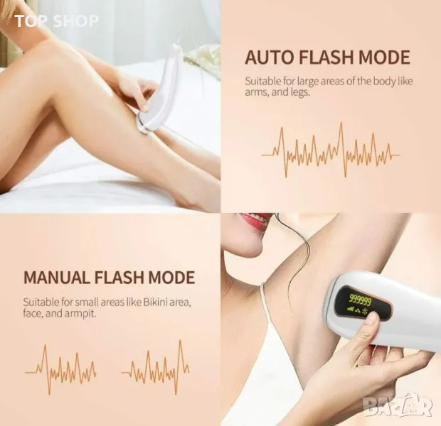 Ръчният режим на светкавица и автоматичният режим на светкавица са предназначени да задоволят вашите изисквания към различни зони за епилация. Режимът на ръчна светкавица се използва главно за премахване на косми в малки области, като линията на бикини, пръсти, устни. Режимът Automatic Flash се използва за по-големи зони за епилация, като ръце, крака, корем и гръб. И той непрекъснато ще сканира тена на кожата и автоматично ще регулира интензитета на светлината. Натиснете и задръжте бутона за светкавица за 3 секунди, за да превключите режима