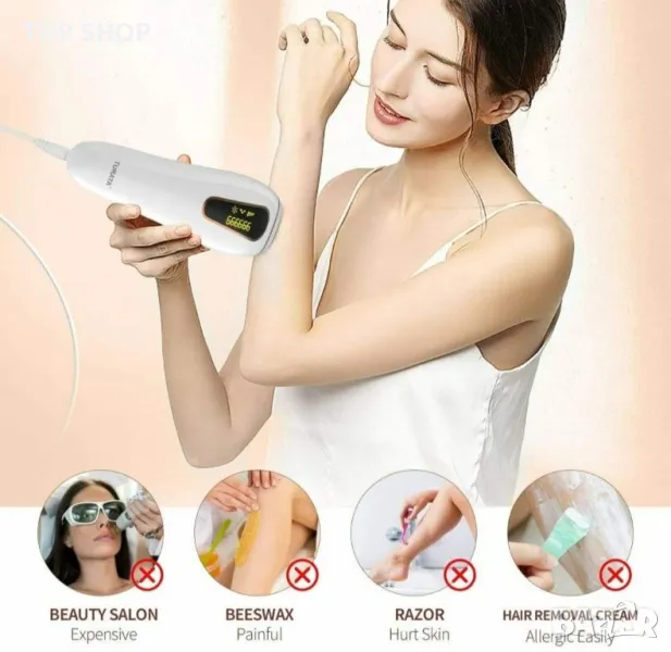 Постоянното обезкосмяване означава, че в цикъла на растеж на косата, с помощта на нашия IPL апарат за премахване на коса, космените фоликули започват да се свиват, растежът на косата се забавя, косата намалява с повече от 90% след 8 седмици и косата става забележимо по-малко и по-тънка. В сравнение с разходите за епилация в салона, това ви дава комфорт и безболезнено, но ефективно изживяване при епилация.