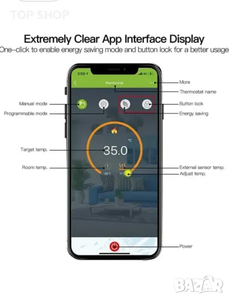 Съвместим с Amazon Alexa Echo и Google Home, управлението на програмата и изгледът на термостата са удобно под ръка, могат да се управляват дистанционно чрез приложението.