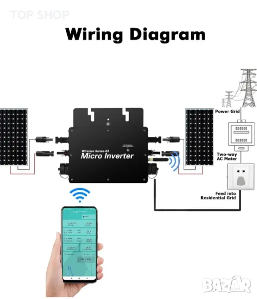 соларен инверторен мрежов преобразувател с WiFi система за наблюдение през мобилен телефон EU 220V