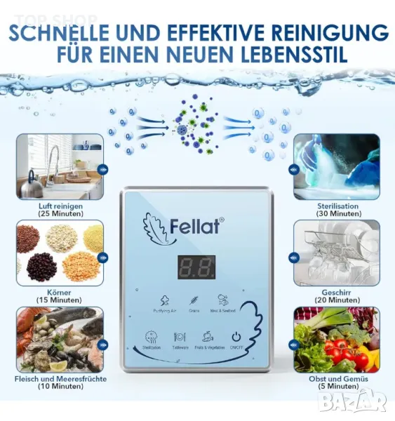 ШИРОКО ИЗПОЛЗВАНЕ В ЕЖЕДНЕВИЕТО: Режимът с озонов въздух може да се използва за домашна стая, кухня, офис, премахва всички миризми, включително тези на дим, домашни любимци и готвене. Плодовете, зеленчуците и месото могат да останат свежи по-дълго след почистване с озонирана вода. Подходящ е и за плантации и рибовъдство.