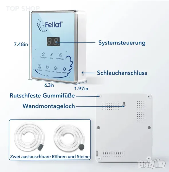 СЪВЕТ ЗА БЕЗОПАСНОСТ: Всички генератори на озон трябва да се използват само в свободни пространства и не допускайте хора или домашни любимци в района. След като почистването с озон приключи, моля, отворете вратите и прозорците за вентилация и изчакайте търпеливо 30 минути, преди да влезете в стаята. Обхватът на доставката включва 2подвижни тръби и 2 камъка за дифузьор на озон.