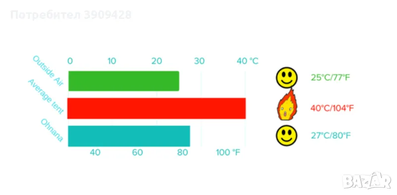 - Специално рефлективно покритие, което реално охлажда палатката с до 13°C в сравнение с обикновените