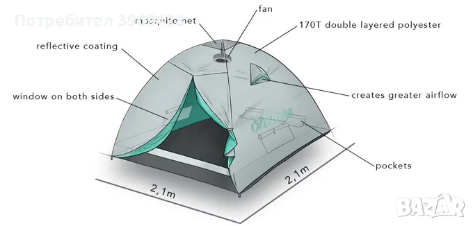 - По-големи размери от стандартните двуместни палатки (2.1м x 2.1м)