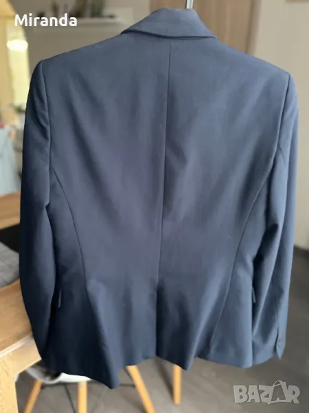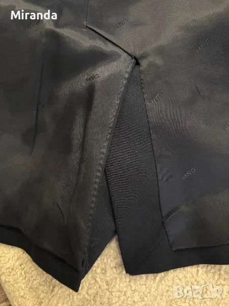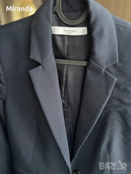 Тъмносиньо вталено сако на Манго, носено няколко пъти, няма външни забележки. Отговаря си напълно на размера. Брандирана подплата, джобовете са декоративни.