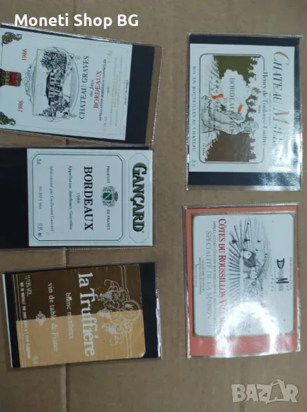Колекцията се предлага на малки лотове по 10 бройки. Качество и състояние видно от снимките. Събирана е повече от 20 години. Подходяща е както за начинаещи така и за професионални колекционери за да попълнят липсващите марки и години. Подходяща е за пана за къщи, механи и винени заводи. Подходяща са за дизайнерски студиа и агенции, за вдъхновявания на дизайнери като модели и сюджети както и да бъдат използвани за изследване на тененциите на етикети през различните години на винопроизводителите. Молим измамници, които възнамеряват да купят стари бутилки колекционерски вина, които не са били съхранявани правилно и бутилките са с изгнили, мухлясали или паднали етикети да не се свързват с нас. Ние няма да им съдействаме в престъпните намерения. Правим това уточнение, защото вече се свързаха такива лица с нас с идеята да купят етикети от колекцията и да ги залепят на такива етикети вино, които да продадат за оригинали на богати колекционери. Да, ние знаем, че етикета продава! Ние предираме за етично поведение и отношение в колекционерските среди. Цената от 3 лева на брой не се коментира дори и при покупка на 500 - 700 - 1000 екземпляра. Идеята е тези етикети на ниска цена да достигнат до повече колекционери и да донесат повече радост на повече хора.