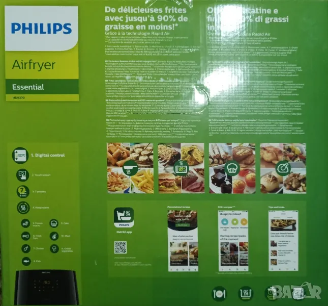 Philips HD9270 е част от серията 3000 Airfryer XL и предлага здравословно приготвяне на храна с до 90% по-малко мазнини благодарение на технологията Rapid Air.ази технология използва уникален дизайн тип „морска звезда“, който завихря горещия въздух, за да създаде ястия, хрупкави отвън и крехки отвътре, с малко или никаква добавена мазнина. Основни характеристики:Мощност: 2000 W Капацитет: кошница със съвместимост 1,2 кг и съд с обем 6,2 л, подходящи за приготвяне на до 5 порции наведнъж. Сензорен екран: предварително зададени програми за различни ястия, включително замразени закуски, пресни пържени картофи, месо, риба, пилешки хапки, торта и зеленчуци на скара Функция за поддържане на топлината: поддържа храната на идеалната температура до 30 минути след приготвяне. Многофункционалност: позволява пържене, печене, приготвяне на скара, запичане и дори претопляне на храна.Лесно почистване: подвижните части са подходящи за съдомиялна машина, което улеснява почистването. За допълнително вдъхновение и насоки при готвене, можете да изтеглите приложението NutriU, което предлага стотици вкусни и здравословни рецепти, съобразени с вашите предпочитания.Philips HD9270 е проектиран да улесни здравословното готвене у дома, предоставяйки разнообразие от функции и лесна употреба.Изпращам по Еконт с преглед и тест
