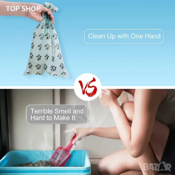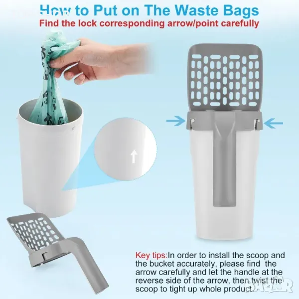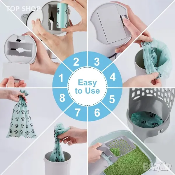 2 В 1 Лопатка за котешки тоалети с държач: Почистването и събирането са в едно, не само лъжица за котешки тоалети, но и с допълнителни торбички, можете да почиствате изпражненията на вашия домашен любимец с една ръка, удобна е и подходяща за ежедневно почистване.Торбички за изпражнения от 120 части: Включва торбички за изпражнения от 120 части, тези торбички са направени от добър парфюм, който може ефективно да намали миризмата на котешка тоалетна с кутията. Доставяме повече торбички за клиентите, за по-добро използване.Дозатор за торбички за изпражнения: Мек и лек на този дозатор, който осигурява друг начин за почистване на домашни любимци, 120 парчета котешка тоалетна могат да се използват с държач за колело с гребло, също може да се използва с този дозатор. Ако вземете домашния си любимец със себе си, свържете този диспенсър за торбички към въжето за домашни любимци, много удобно!Висококачествен материал: Лъжичката е изработена от PP материал. Той е лек и издръжлив за използване. Работа с една ръка, директно събиране на котешки отпадъци в кофата за отпадъци, лесна за работа, по-добра от традиционния начин на почистване.Включен опаковъчен списък: 1* лъжичка за котешка тоалетна с държач 1* дозатор за торби за котешки отпадъци 8 к-т* торби за отпадъци