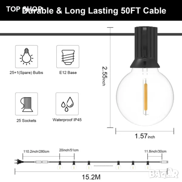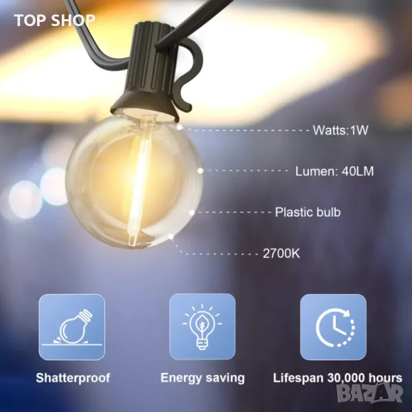 Устойчиви на разбиване G40 LED крушки: Използвайте силно пропускливи акрилни пластмасови материали вместо чупливи традиционни стъклени крушки. Издържа на всякакви климатични условия през цялата година и е подходящ за декориране на външно осветление. Оборудван с 25 LED крушки и 1 резервна крушка, безопасен, надежден, спестяващ енергия и пари.