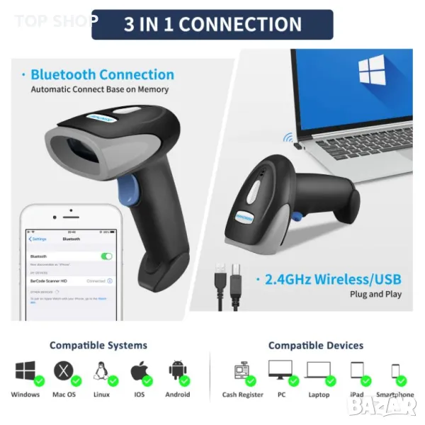 Връзка на скенер за баркод 3 в 1 с мощни съвместимости: