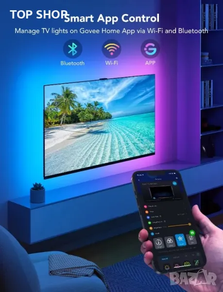 Симфония от RGBIC осветление: Технологията Govee RGBIC реализира цветния сегментиран дисплей на светлините отзад на телевизора, създавайки по-динамични и великолепни светлинни ефекти. Насладете се на по-живи цветове в светлините на вашия телевизор и надстройте своите визуални ефекти.Приложение и гласово управление: Управлявайте светлините на LED телевизора чрез приложение или интелигентно гласово управление с Alexa и Google Assistant. ( Моля, обърнете внимание, че няма да улавя цветовете автоматично и поддържа само 2.4G.)Множество предварително зададени сцени: Приложението Govee Home предлага 99+ предварително зададени сценични режима и 11 музикални режима, от които можете да изберете светлинните ефекти, които отговарят на вашето настроение или атмосферата около вас, за да подобрите гледането си.Синхронизиране на музика: Govee TV LED Backlight включва вграден микрофон, което прави цвета и яркостта синхронизирани с музиката. Насладете се на спиращи дъха светлинни ефекти, които танцуват с всяко аудио, сякаш сте на концерт.Гъвкава инсталация: Телевизионната подсветка от 12,5 фута може лесно да покрие 4 страни на всеки 55-65 инчов телевизор. Препоръчително е да използвате кабелните скоби, за да закрепите LED лентите на телевизора, за да прилягат плътно към вашите телевизори