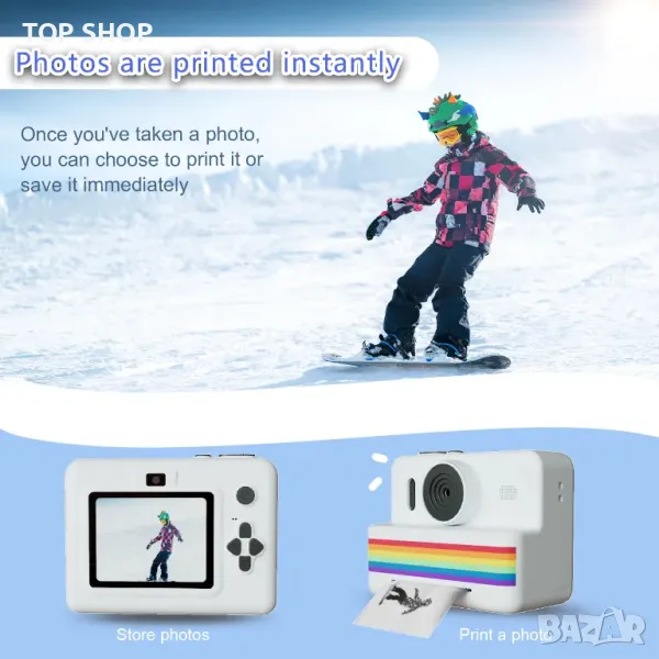 Тази детска камера използва технология за термичен принтер, просто натиснете бутона, за да получите черно-бяло отпечатано изображение за секунди. Подобреният дизайн на въртящите се на 180° камери позволява на децата да правят снимки или селфита, много лесни за работа.