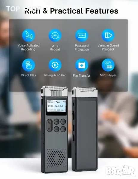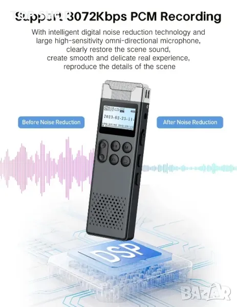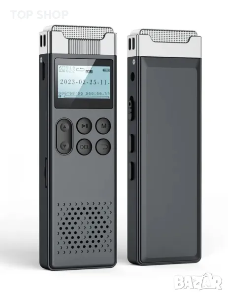диктофонът поддържа външни карти с памет до 128 GB.Технология за HD запис и намаляване на шумаНай-новият модел има цифрова технология за намаляване на шума. Рекордерът използва кондензаторен микрофон с голям калибър с висока чувствителност, за да записва дори далечни, дълбоки, но ясни звуци. Цифровият диктофон има и вградени висококачествени Hi-Fi стерео говорители и осигурява ултра чисто качество на запис. С по-висок битрейт се постига още по-високо качество на звука (до 3072 kbps).Запис с едно докосване и гласово активиране: благодарение на функцията за запис с едно докосване можете да записвате бързо и лесно, без да пропускате важно съдържание. Функцията за гласово активиране автоматично започва запис, когато звукът достигне определен брой децибели, и спира записа, когато шумът вече не се чува. По този начин спестявате място и често можете да използвате функцията в клас или при изучаване на езици.ЛЕСНО УПРАВЛЕНИЕ НА ФАЙЛОВЕ & Парола - Диктофонът записва записани файлове с клеймо за време за проследяване. Преносът на данни и зареждането става чрез предоставения USB кабел. Аудио рекордерът е съвместим както с Windows, така и с Mac операционни системи. За да се свържете с компютър Mac, е необходим USB-C към USB-A кабел, тъй като предоставеният кабел е Micro USB 2.0 Type A кабел. Допълнителна сигурност за вашите файлове осигурява защита с парола.Съдържание на кутията: 32 GB диктофон, USB 2.0 кабел за зареждане, ръководство за потребителя на английски, немски, италиански, френски и испански, както и слушалки. Устройството се предлага с една година гаранция. Ако имате някакви въпроси относно продукта, моля не се колебайте да се свържете с нашия отдел за обслужване на клиенти, който с удоволствие ще ви помогне.