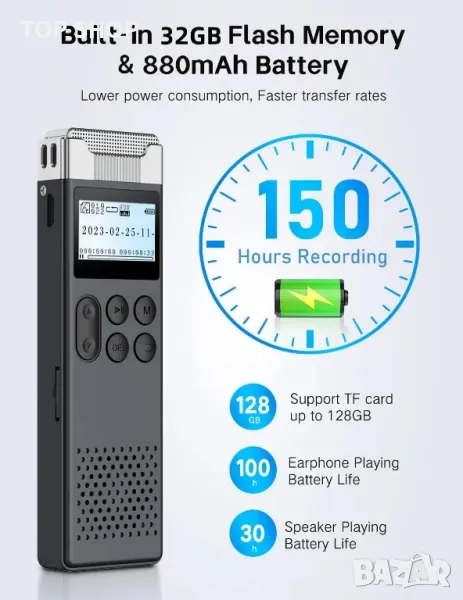 https://www.amazon.com.be/-/en/LIMENAMICS-One-Touch-Recording-Conference-Interview/dp/B0BTYBZPTGНадстроена флаш памет и висока производителност на батерията: Благодарение на подобрения дизайн на вътрешната флаш памет, не само консумацията на енергия е намалена, но също така се увеличава скоростта на трансфер. Батерията от 880 mAh позволява до 150 часа непрекъснат запис или 100 часа възпроизвеждане на музика. Вътрешната памет с капацитет от 32GB може да побере до 580 часа запис или 6000 песни. Освен това