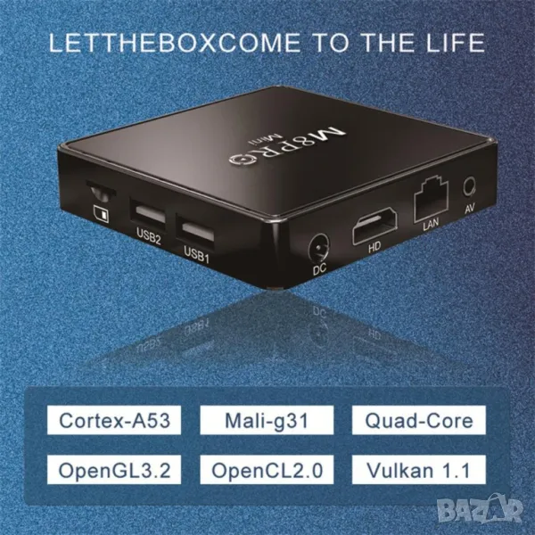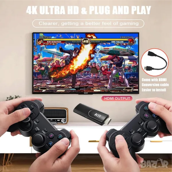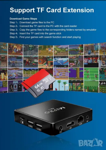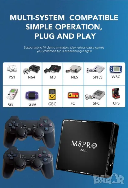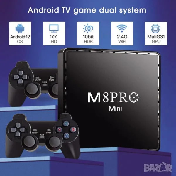 Мини Игровата конзола M8 Pro предлага впечатляваща комбинация от ретро чар и модерна функционалност, което я прави отличен избор за забавление у дома.Независимо дали сте фен на класическите игри или искате да подарите уникално игрово изживяване на децата, M8 Pro доставя забавление за всеки.Ключови предимства:4K резолюция: Поддръжка на вградените игри на 4K екрани за ясно и детайлно изображение.Огромна библиотека от игри: С над 33 000 предварително инсталирани игри и 9 емулатора, можете да се наслаждавате на класики от различни поколения.Двойна система: Функционира и като Android TV с версия 12.1, което позволява гледане на видеоклипове, стрийминг и много други.Функции за търсене и запазване на игри: Лесно намирайте любимите си игри и запазвайте прогреса си.Безпроблемна свързаност: Свържете се лесно с телевизори или компютри чрез HDMI.Възможност за инсталиране на филми, игри и образователни приложения по избор на потребителя.Технически характеристики:Процесор: Allwinner H313 (четириядрен ARM Cortex-A53).Графика: G31 OpenGL3.2 – гарантира плавна работа дори при по-натоварващи игри.Памет: 2GB RAM и 16GB ROM, с възможност за разширение чрез карта памет.Операционна система: Android 12.1.Свързаност:2 USB 2.0 порта.Ethernet LAN (RJ45) и Wi-Fi (2.4G).HDMI интерфейс. 1x Карта памет за игри.1x Дистанционно управление.Размер и преносимост:Конзола: Компактен размер от 82x82x11 мм – идеална за пестене на място.Опаковка: Лека (0.56 кг), което улеснява пренасянето.