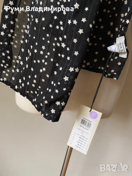 Черен шал Masai, с етикет от 98 % вискоза и 2 % метални нишки, с етикет цената на него е 29 €, на бели звездички и блестящи райета, много, фина материя, подходящ за официален тоалет, нов, доставка с Еконт.