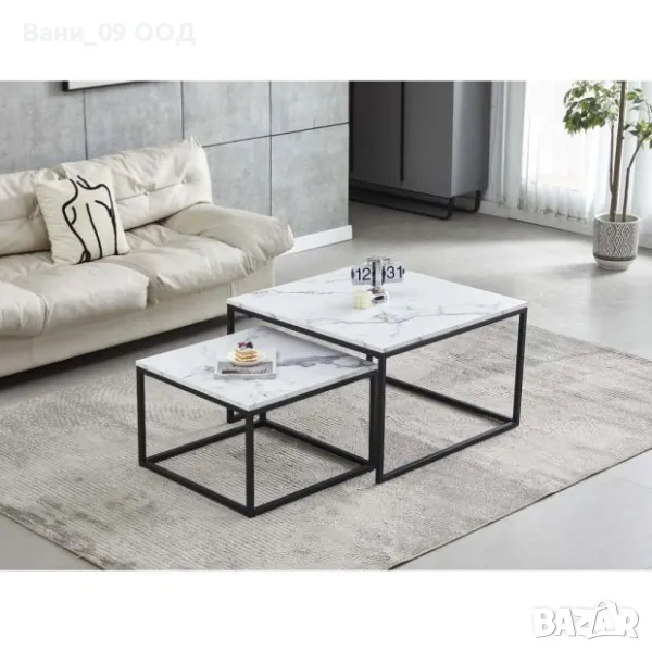 Сет от 2 броя холни маси с плот от ПДЧ, имитация на бял мрамор и размери: 80/80/50 см; 60/60/40 см