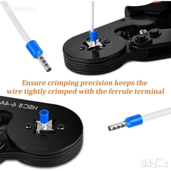 Саморегулираща се матрица: Автоматично се адаптира към напречното сечение на проводниците, осигурявайки сигурно и точно кримпване.