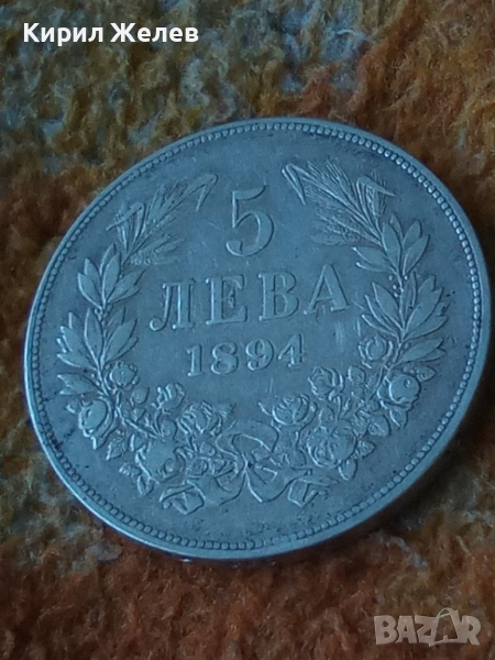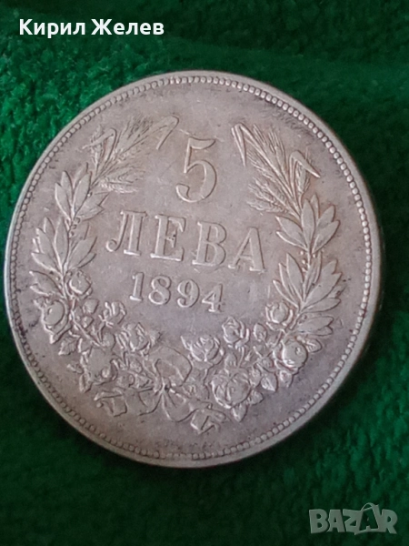 ДържаваБългарияПериодКняжество България 1878 - 1907ВалутаБългарски левТип монетаМонети в обращениеНоминал5 леваЦена на метала25 XAGg x 0,900 = 42 BGNГодина1894УправникФердинанд IМеталСребро 0.900Тип на ръбаНадписанОписание на ръбовете'Боже пази България'ФормаКръгОриентацияМонета (180°)Тегло (g)25Диаметър (mm)37Дебелина (mm)2,9
