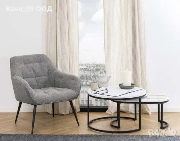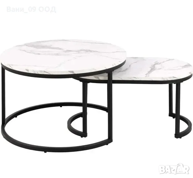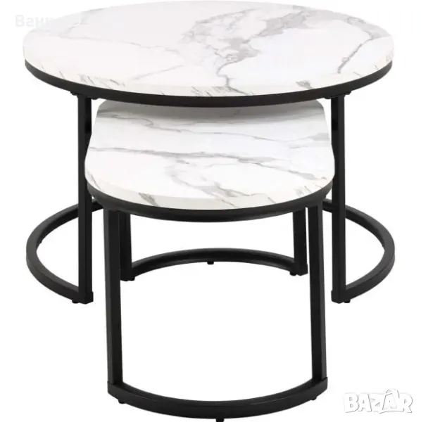 Комплект от два броя холни маси с размери Ø70x42 см, и Ш:70/Д:40/В:34.5 см. Много практично, малката маса може да се прибере под голямата маса и по този начин да освободите пространство в помещението. Със своя дизайн и плотове от ПДЧ, имитация на бял мрамор, холните маси ще добави желан лукс и стил към помещението. Рамките на масите са с протектори щадящи пода, произведени от метал стилно прахово боядисани. Плотовете са произведени от висококачествено ПДЧ с меламиново покритие с овална форма. Със своята вродена елегантност без усилие създават приятна атмосфера на спокойствие и уют. Кръглата маса е изключително лесна за вписване към повечето интериори, по-безопасна (без ъгли), като изпълнява пълноценно своята функция. Поставена до комфортната мека мебел, освежителните напитки ще са само на една ръка разстояние.