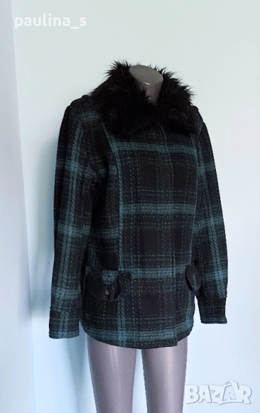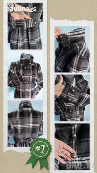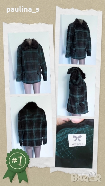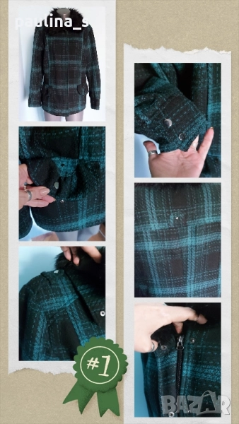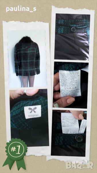 2️⃣. Колаж / XL / 2XL - "Yessica". Цената е крайна, без пазарлъци 49,99лв / 25 евро. Дамско палто с подвижна яка, в зелено - черно каре. Моделът е с втален силует, джобове с капаци и тик-так копчета, закопчаването е със секретни тик-так копчета и цип. Материята е немачкаема - полиестер, без еластичност. Перфектна дреха и много тренди.