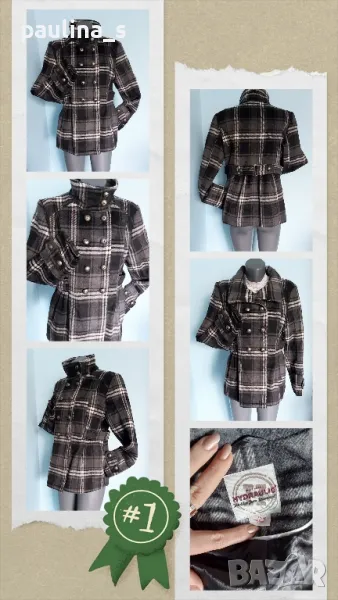 1️⃣. Колаж / L / 2XL - "Hydraulic the blue jean standard". Цената е крайна, без пазарлъци 69,99лв / 35 евро. Разкошно двуредно палто със съдържание на рециклирана вълна. Моделът е с висока яка, става на ревер, скрити джобове, коланна платка, двойни копчета на ръкавите. Талията е висока, копчетата са сребърни цилиндърчета, платът е дебел и не се степва при пране или глади, стои много елегантно. Голяма тупалка е, приковава погледите. Като ново, без дефекти и етикет.