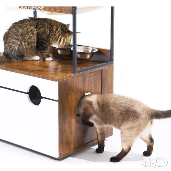 Тази многофункционална мебел за домашни любимци е перфектна комбинация от къща, кът за хранене, с поставка за 2 купи, дърво за драскане, хамак за почивка и място за съхранение.