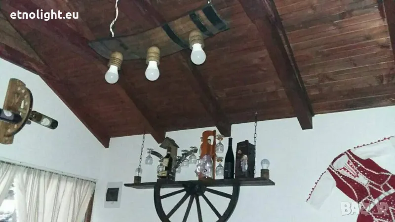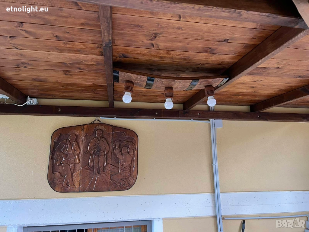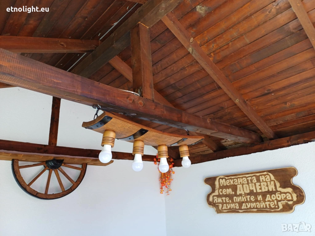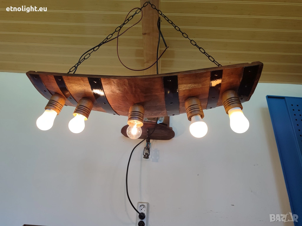 Полилеи от автентични рестарирани бъчви с ръчно изработени дървени чашки,цвят и фасунга по избор,могат да бъдат със или без синджир според височината на тавана ви,дължина около 75 см,може да бъдат и с 4 чашки-79 евро. с 5 чашки 89 евро