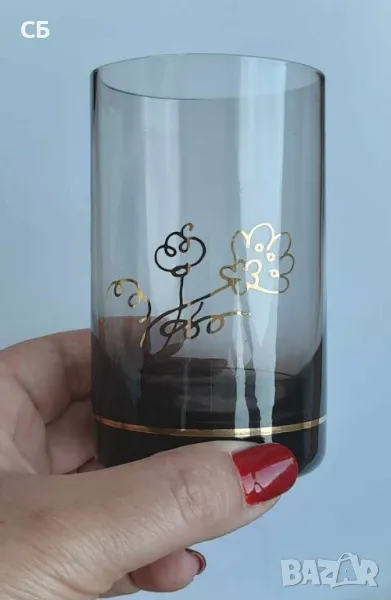 1. 6 чисто нови чаши от опушено стъкло с дебело дъно и златна декорация - България - вм. 100 мл, в. 10 см - 10 евро