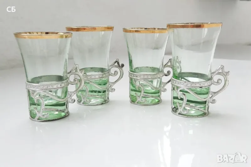 5. 4 зеленикави чаши с дебело дъно и метален обков - златният кант е нарушен на места - Русия - вм. 40 мл, в. 7 см - 5 евро общо