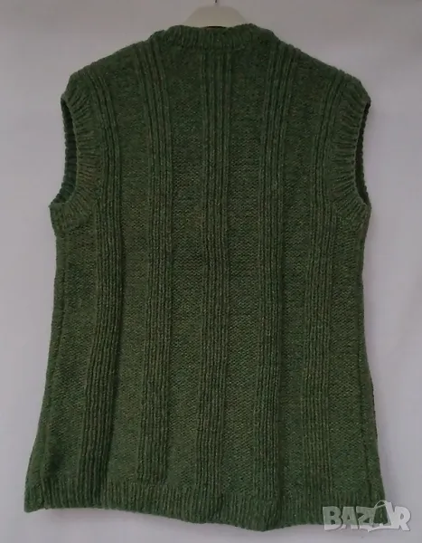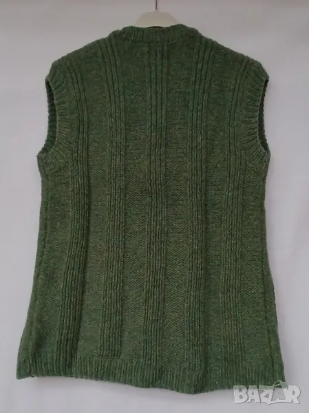 Вълнен елек зелен с обло деколте отворен и джобове. Обиколка на гърдите 104 см.