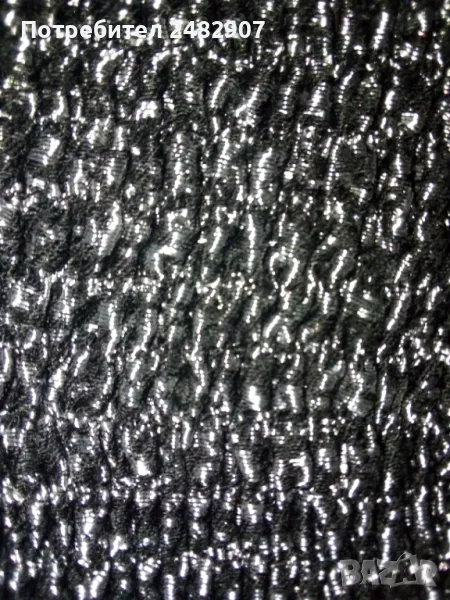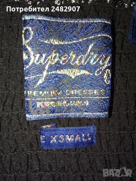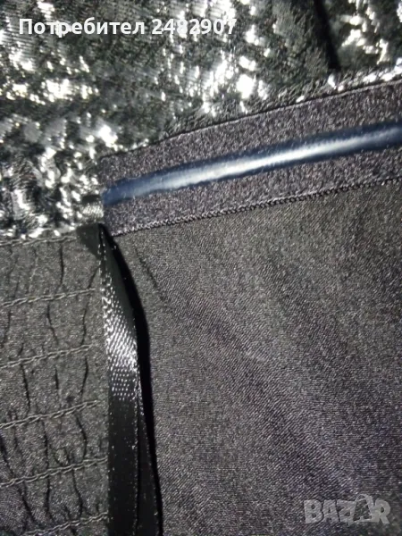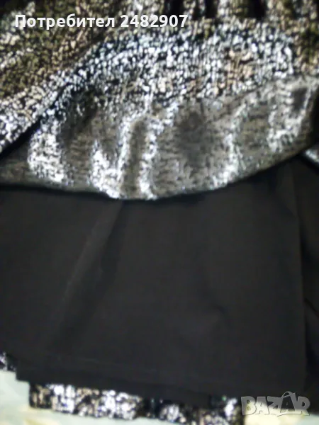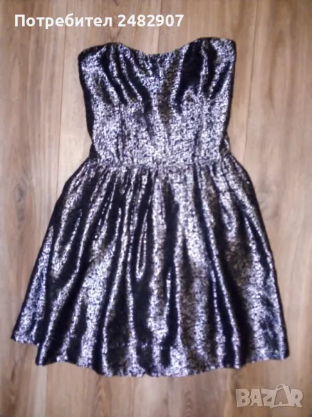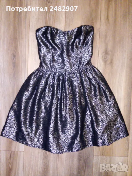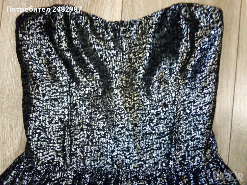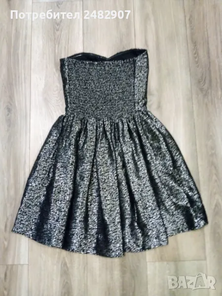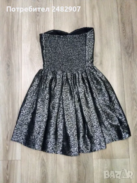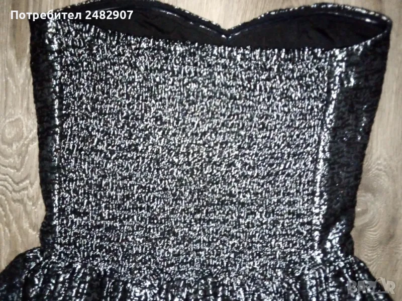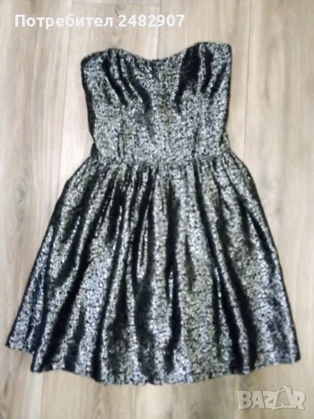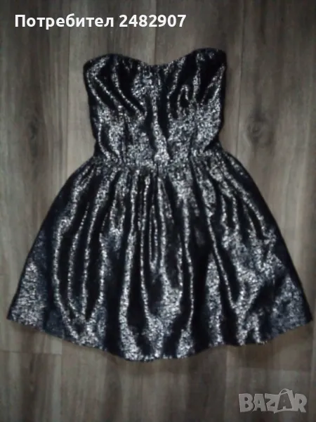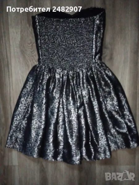 Сребриста бална рокля, тип "бюстие", размер XS. Съдържа 100 % полиестер, подплата, силиконова лента в предната част на деколтето и ластичета на гърба. Ширина под мишниците - 33 см, ширина в талията - 30 см, ширина в долната част - 92 см, дължина от под мишниците до долу - 66 см. Обличана е веднъж за повод, отлично състояние, без забележки, много сладка и ефектна. Не се мачка.