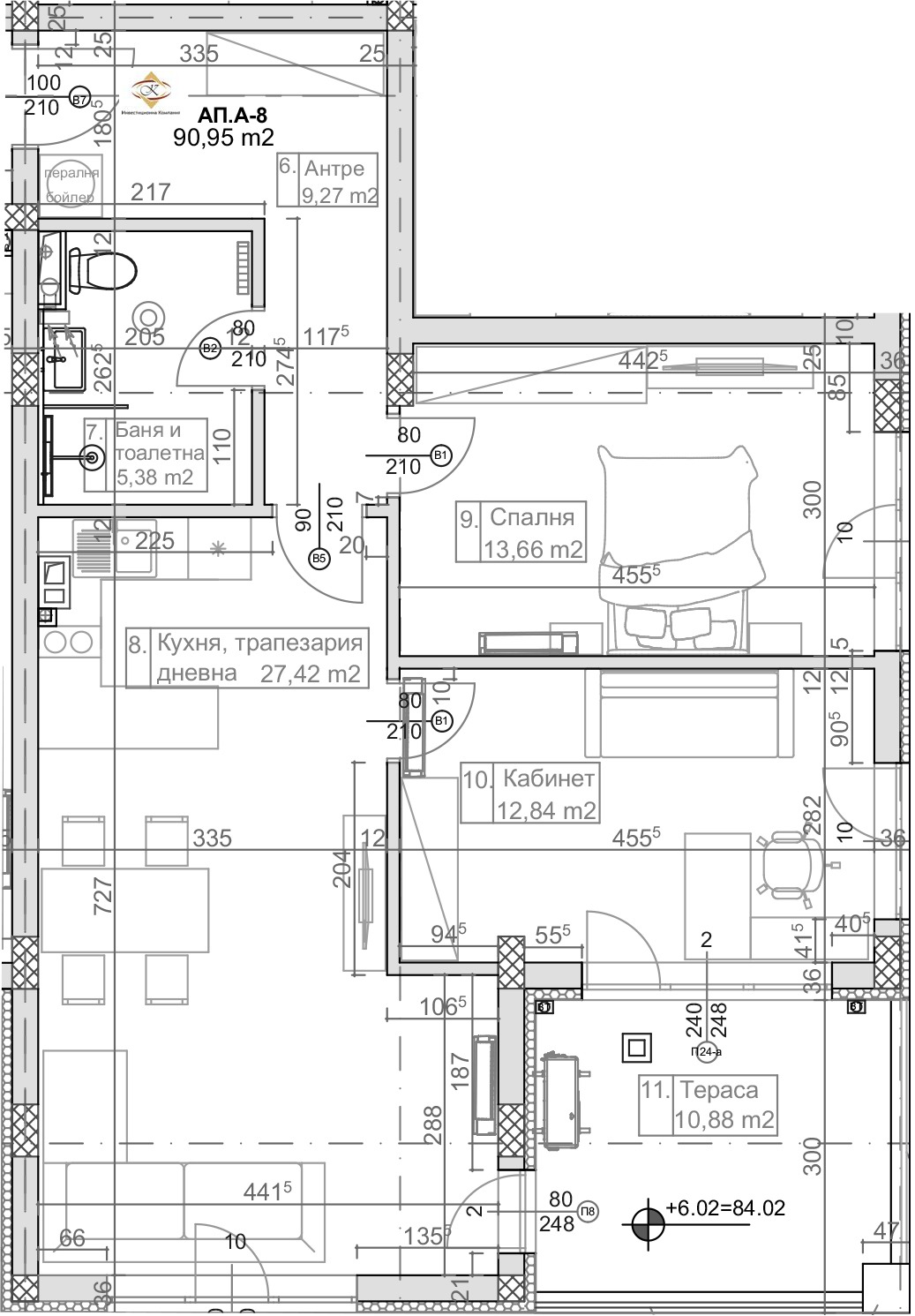 Апартамент А-8 е разположен втори етаж в секция 'А' и се състои от: дневна с кухня, две спални, коридор, баня с тоалетна и голяма тераса с вдъхновяваща гледка към морето. Срокът за завършване на проекта е пролетта на 2027 година.