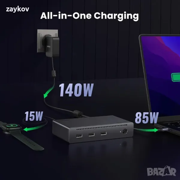 Всичко в едно зареждане: Thunderbolt Dock се предлага с преносим 140W GaN променливотоков адаптер, за да поддържа вашия лаптоп захранван с 85W максимално зареждане през Thunderbolt 4 upstream порт, като същевременно зарежда другите ви устройства с до 15W чрез Thunderbolt 4 downstream пристанища.