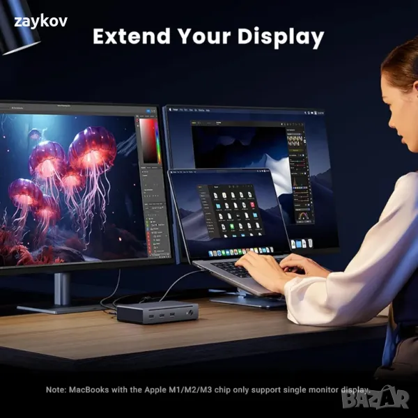 Двоен 4K@60Hz дисплей: Свържете двойни дисплеи чрез Thunderbolt 4 портове на докинг станцията Revodok Max 208 при 4K@60Hz, допълнително подобрявайки вашата многоекранна продуктивност и творчески работни процеси. (MacBook с чип M1, M2, M3 поддържа само един дисплей)
