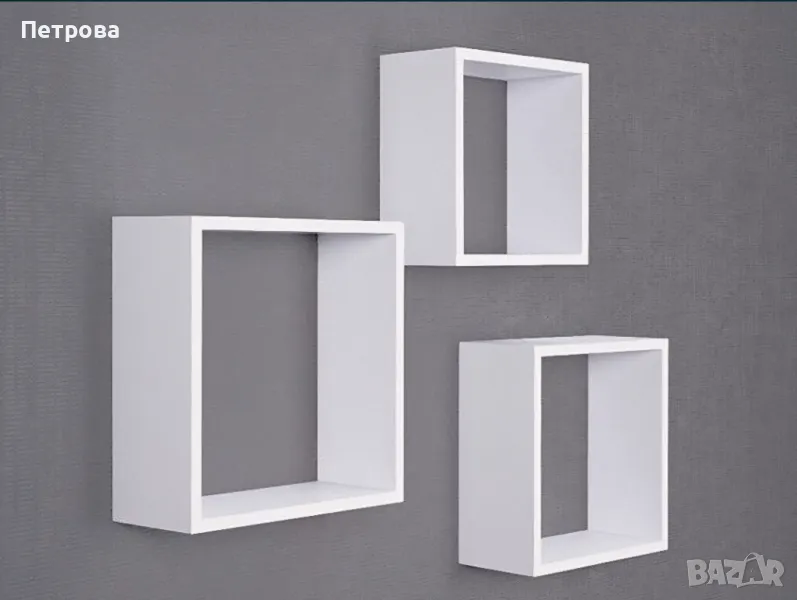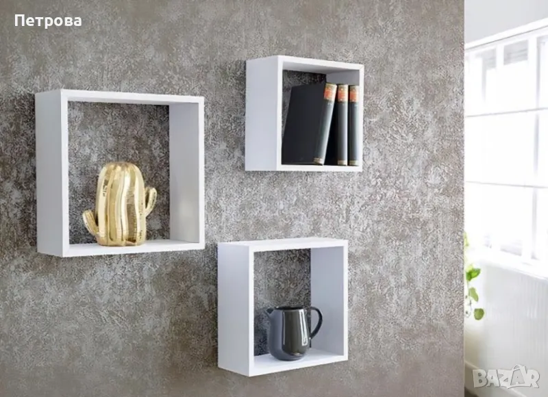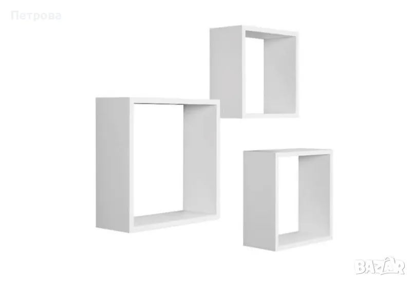 Комплект от три броя квадратни етажерки. Изработени са от ПДЧ,в класическия бял цвят. Комплектът се състои от три елемента,като всеки един от модулите е с различни размери: