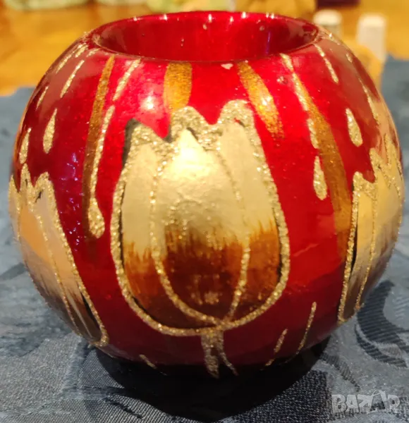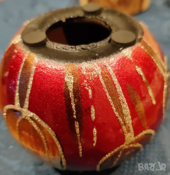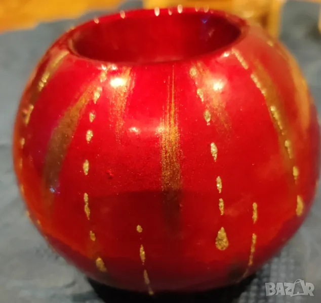 Декорирана кутия за бижута. Височина 4 см. Диаметър 7.5 см. Цена 13 лв. Свещник за чаена свещ. Височина 8 см. Диаметър 10 см. Цена 5 лв.