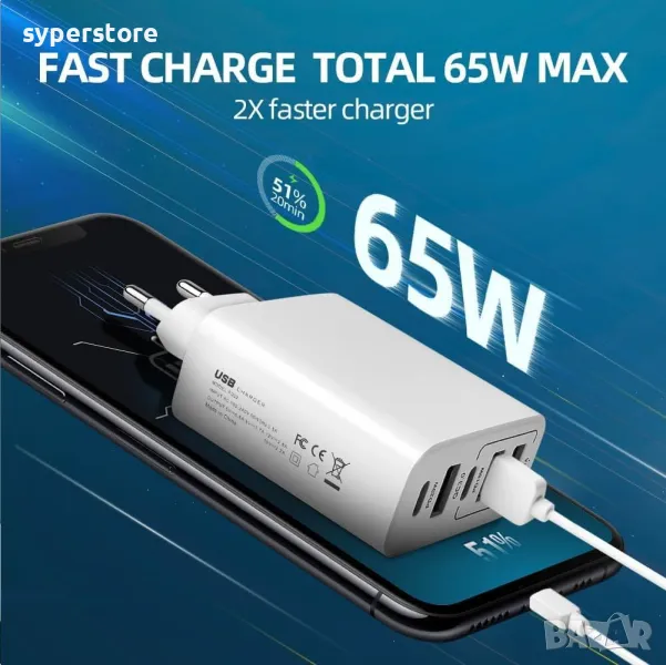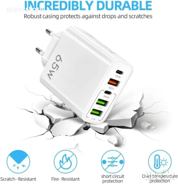Характеристики: защита от прегряване, три USB порта, защита от пренапрежение и късо съединение, два PD 3.0 Type-C порта, 65W, 3.1A бързо зареждане