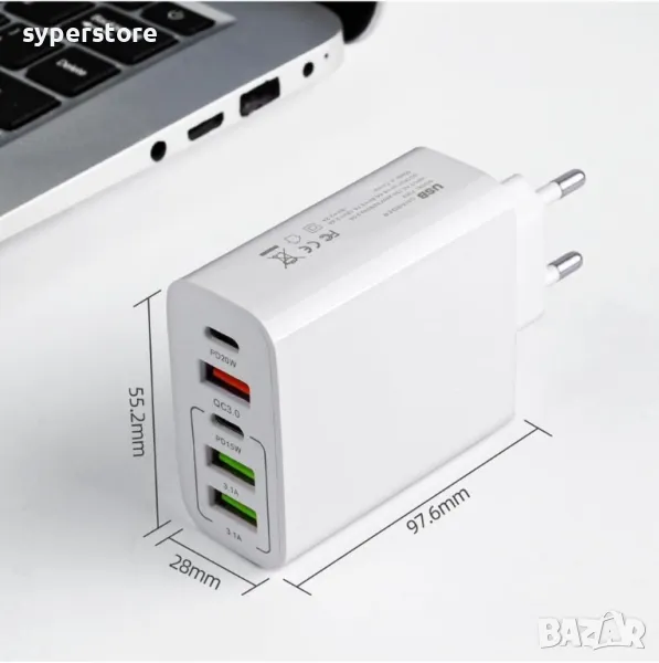 Зарядното устройство с мощност 65 W включва три USB порта и два USB-C порта. Това е идеален избор както за домашна употреба, така и за пътуване - предлага бърза мощност и гъвкавост за мобилни устройства! Мрежовото зарядно устройство с 5 порта е идеалното решение за бързо и ефективно зареждане на вашите устройства. мобилен. С 65 W бързо зареждане и разнообразна гама от портове, това зарядно устройство предлага всичко необходимо в едно устройство. Можете да зареждате няколко устройства едновременно, без да жертвате скоростта и производителността. Благодарение на трите USB порта и двата порта Type C, той предлага гъвкавост и възможност за зареждане на различни устройства едновременно. Спецификации ОБЩИ ХАРАКТЕРИСТИКИ Тип продукт: Мрежово зарядно устройство Съвместима марка: Apple, Samsung, Huawei, LG, OPPO, Universal Съвместим модел: Universal, P40, P50, P60, iPhone X, iPhone XS Max, iPhone XS, P30 Pro, iPhone 11, iPhone 11 Pro, iPhone 11 Pro Max, iPhone 12 Pro, iPhone 12, iPhone 12 Pro Max, Galaxy S21, Galaxy S21 Ultra, Galaxy S21 Плюс, iPhone 13, iPhone 13 Pro, iPhone 13 Pro Max, Galaxy S22 Ultra, Galaxy S22, Galaxy S22 Plus, iPhone 14 Plus, iPhone 14, iPhone 14 Pro, iPhone 14 Pro Max, Galaxy S23, Galaxy S23 Plus, Galaxy S23 Ultra, iPhone 15 Plus, iPhone 15, iPhone 15 Pro, iPhone 15 Pro Max, iPhone 16 Plus, iPhone 16, iPhone 16 Pro, iPhone 16 Pro Max