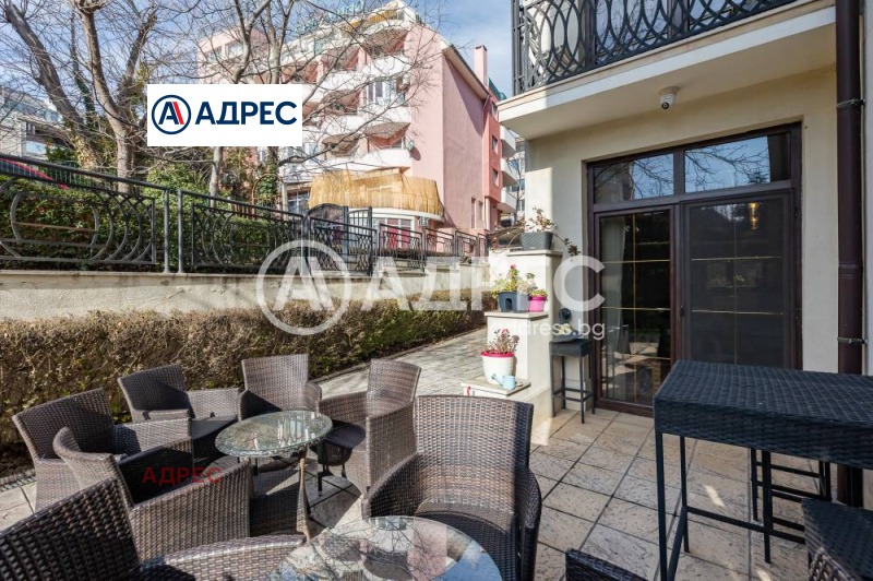 Продаваме офис с площ от 177 кв.м. в близост до Парк Март и Морската градина. Имотът се състои от голяма приемна, просторна зала, две по-малки и 4 сервизни помещения. От офиса се излиза на голяма партерна тераса с различни възможности за аранжиране. Има вариант за втори вход към офиса. Възможност за преустройство на помещения за живеене.