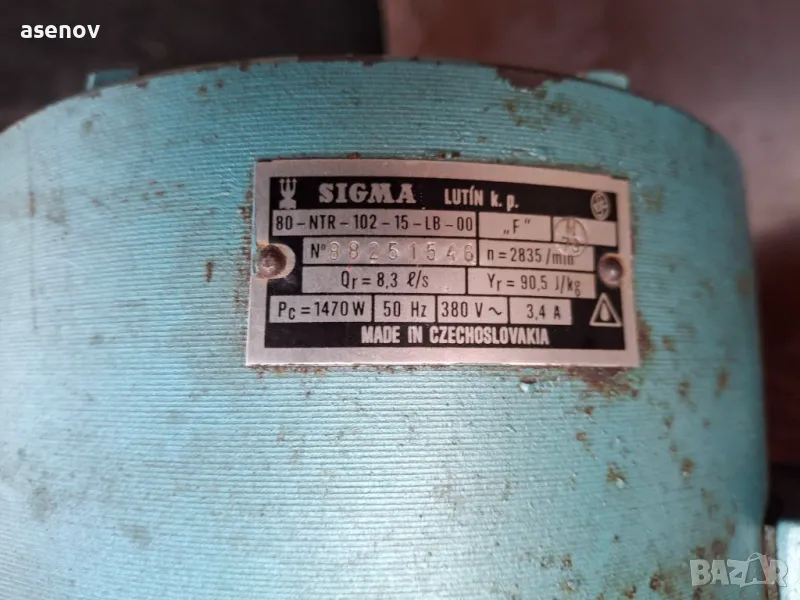 продавам чешка помпа Сигма с мощност 1,5 кв, 2830 оборота в минута, дебир 8,3 литра в секунда; 30 куб. м. за час, тегло 60 кг, вход и изход 3 цола, неизползвана