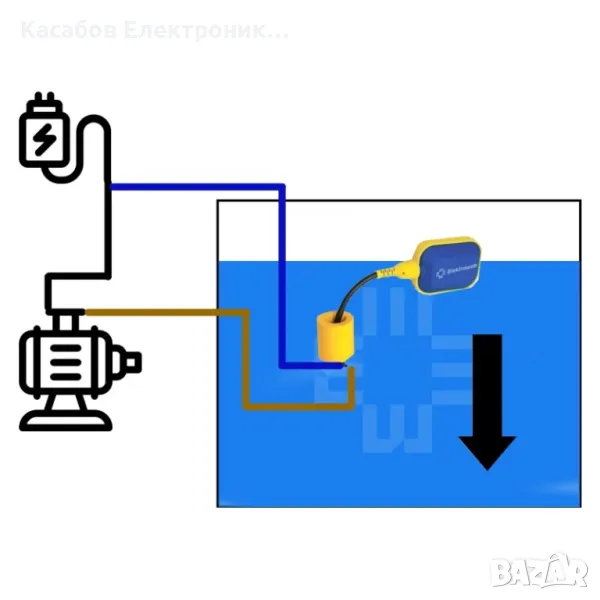 Поплавъчен превключвател за включване/изключване на помпа, с 5-метров кабел, предназначен за използване като сензор за ниво на водата. Работи на 220 V AC.