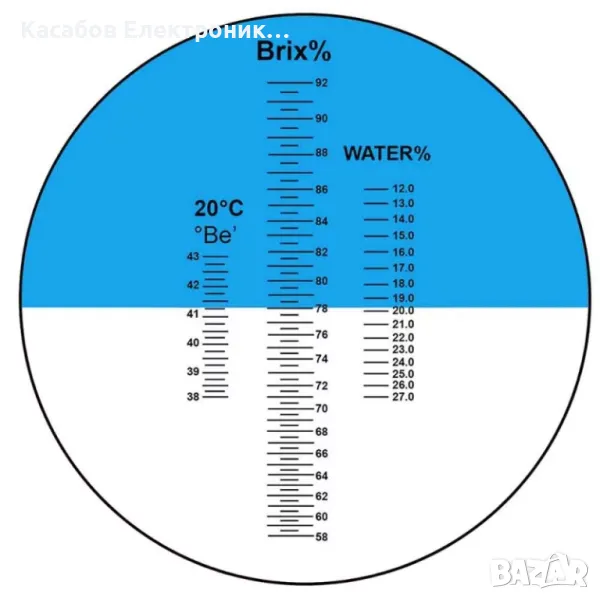 - Brix% скала от 58% до 92% - позволява ви да определите съотношението на захар към вода в разтвора - ако получим резултат от 62%, това означава, че в 100гр разтвор има 62гр захар и 38гр вода