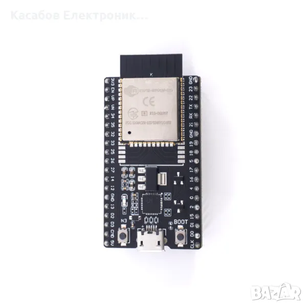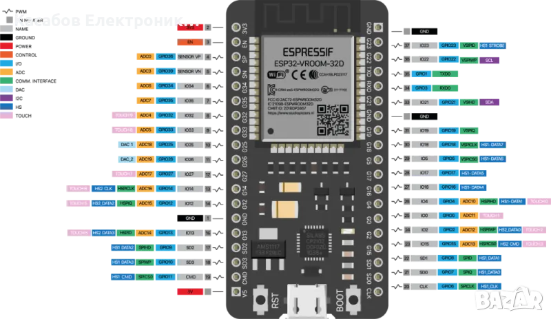 Развойна платка ESP32 с модул ESP32-WROOM-32D с 38 пина и Micro USB порт. Това е мощен микроконролер, който се управлява лесно и може да се свързва с устройства, чрез Bluetooth и WiFi. Благодарение на вградения стабилизатор на напрежение, модулът може да се захранва с 5V. Поддържа следните комуникационни интерфейси: SPI, I2C и UART.