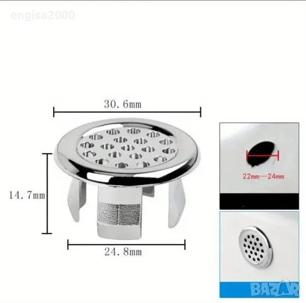 - Диаметър за монтаж: за преливници с размер от 22 до 24 мм.