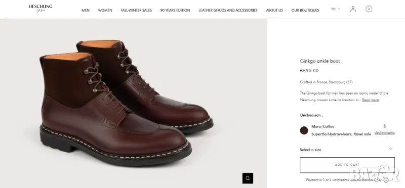 Мъжкият ботуш Ginkgo е емблематичен модел на Heschung Maison от създаването му през 1992 г. Естествено от двоен материал, той съчетава капачка в ловен стил с патентована подметка, за да осигури отличителен външен вид.