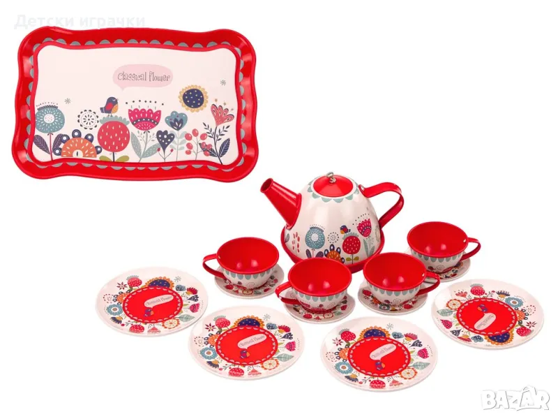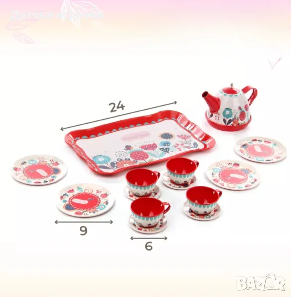 Подносът е идеален за сервиране на напитки и десерти, а чайникът позволява реалистични игри с наливане на чай или кафе. Чашите и чинийките, също декорирани с флорални мотиви, правят забавлението още по-реалистично и приятно. Големите десертни чинии са идеални за сервиране на любимите ви сладкиши.