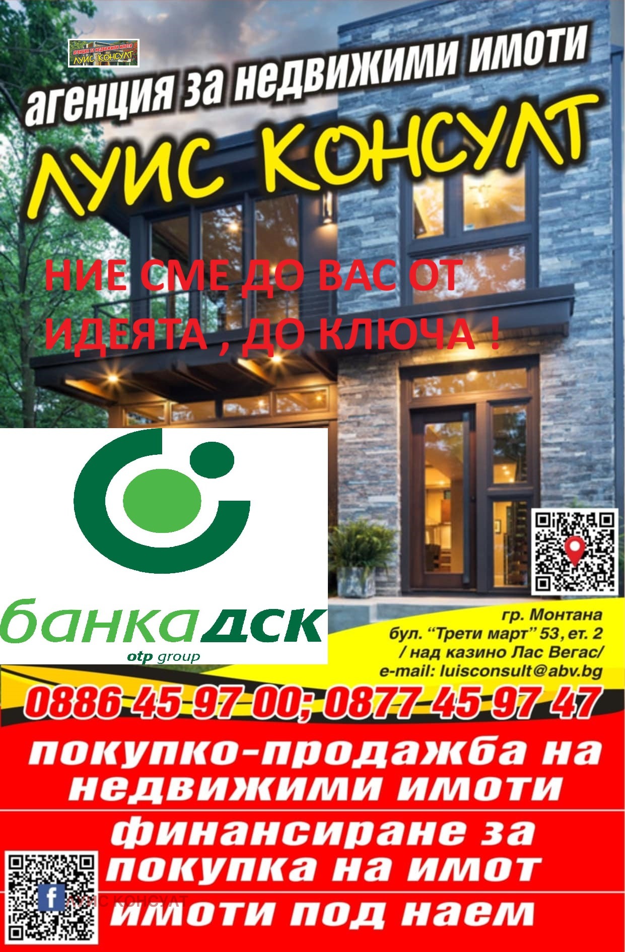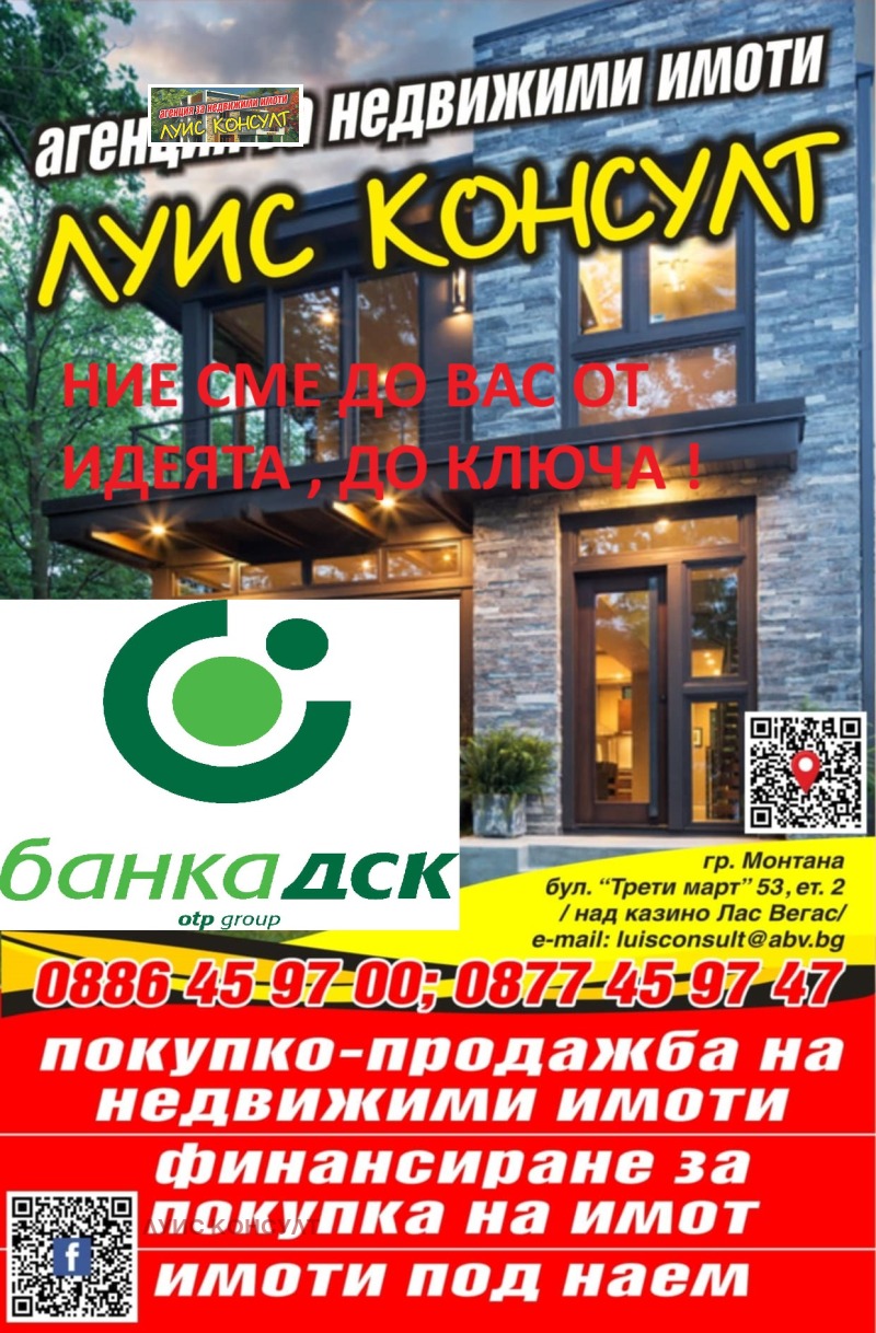 🏢Ние от агенция за недвижими имоти ,,ЛУИС КОНСУЛТ'' оказваме на своите клиенти пълно съдействие за закупуване на желаният имот с ипотечен кредит. Изготвяме всички необходими по сделката документи. Оказваме пълно юридическо съдействие. Коректно обслужване от компетентни брокери с дългогодишен опит в сделките с недвижими имоти. Заповядайте в нашият офис на адрес: град Монтана, бул.,, Трети Март'' 53 ,етаж 2 /срещу книжарница ,,Просвета'', над казино ,,Лас Вегас '' на центъра/. Тел. за контакт: 0886459700 и 0877459747 Пенка Димитрова. Цена на имота 32 000 лева с възможност за разумен коментар след оглед.